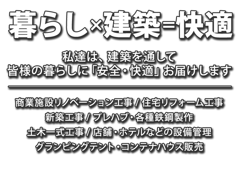 今では、「新築住宅設計・施工」「住宅リフォーム」「商業施設リノベーション」「店舗・ホテル設備管理」など総合建設会社として幅広く対応しております。
